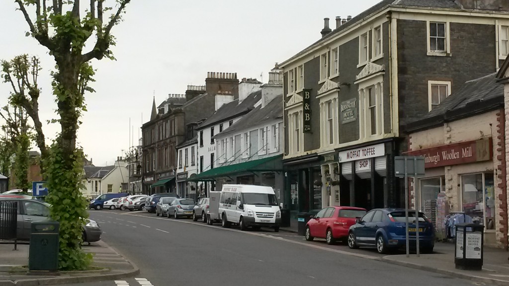 Auf den ersten 28 Kilometern ging es mal wieder schön bergauf, da ich ja auch von Keswick aus dem Lakeland heraus musste. Nach einer Fahrt durch eine Schaf- und Rinderwiese auf einer Höhe von 400m lief es dann aber bis zum Schluss des Tages zwar nicht ganz eben, aber gemächlich dahin. Über Carlisle, das wohl die letzte Bastion der Römer vor den bösen Schotten war, habe ich kurz vor Gredna Green die Grenze nach Schottland überquert. In Gredna Green wird immer noch geheiratet wurde, obwohl die Zeiten der flüchtigen Jugendlichen vor ihren Eltern doch vorbei ist. Für die, die es nicht wussten, durfte in Schottland ohne Einwilligung der Eltern geheiratet werden, obwohl man noch nicht volljährig war. Daher flüchteten viele junge Paare nach Gredna Green. Danach gab es nicht viel sehenswertes, daher ging die Fahrt bis nach Moffat, das ich nach 118 Kilometern erreicht hatte. Hier wollte ich mir am Abend das Eröffnungsspiel der WM ansehen. Ich fand auch eine Sportsbar, doch nebenan saßen vier schottische Barden mit Gitarren und Fidel, bei denen es weit mehr Spaß machte zuzuhören. W3.44361 N55.3318