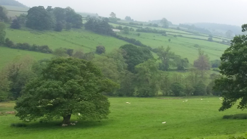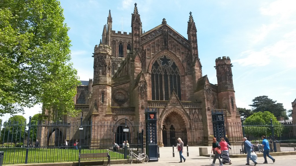 Die Sonne ist geblieben, auch wenn die hier Gewitter angesagt hatten. So konnte ich die ersten 20km locker durch das Tal des Flusses Wye radeln. Schön anzusehen war der allerdings nicht, da er wohl viel Sand mit sich führt und daher aussieht wie braune Brühe. Aber er bildet auch eine Grenze, die man hier nicht wahrnimmt. Die zwischen Wales und England. Und hätte ich es in Tintern nicht zufällig gelesen, hätte ich es wohl nur an dem Grenzschild bemerkt, das ich passiert habe. Ich glaube auf der Weltkarte, die ich mir in der Kathedrale von Hereford angeschaut habe, hätte ich die auch nicht gefunden. Dort hängt eine Mappa Mundi. Die größte noch existierende ihrer Art. Dabei handelt es sich um eine runde Karte, die um 1300 hergestellt wurde und die damals bekannte Erde in religiöser Geschichtsform darstellt. Stop war heute in nach 87km in Wigmore. W2.85887 N52.31651